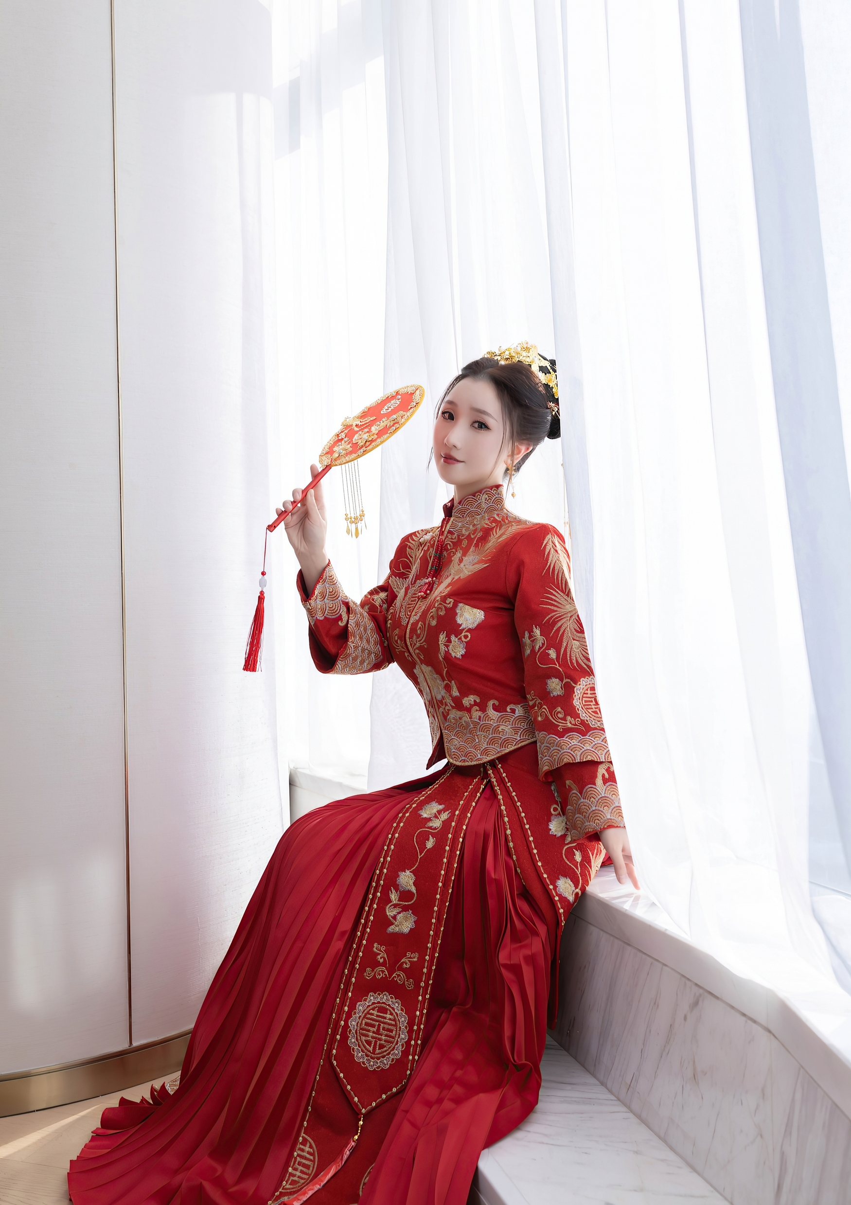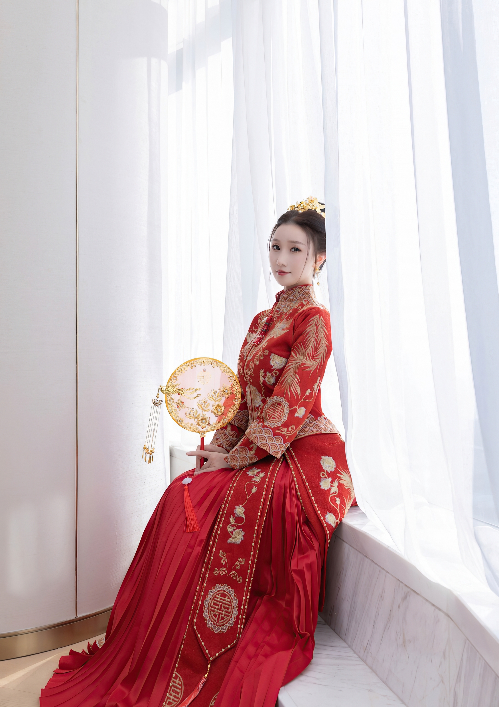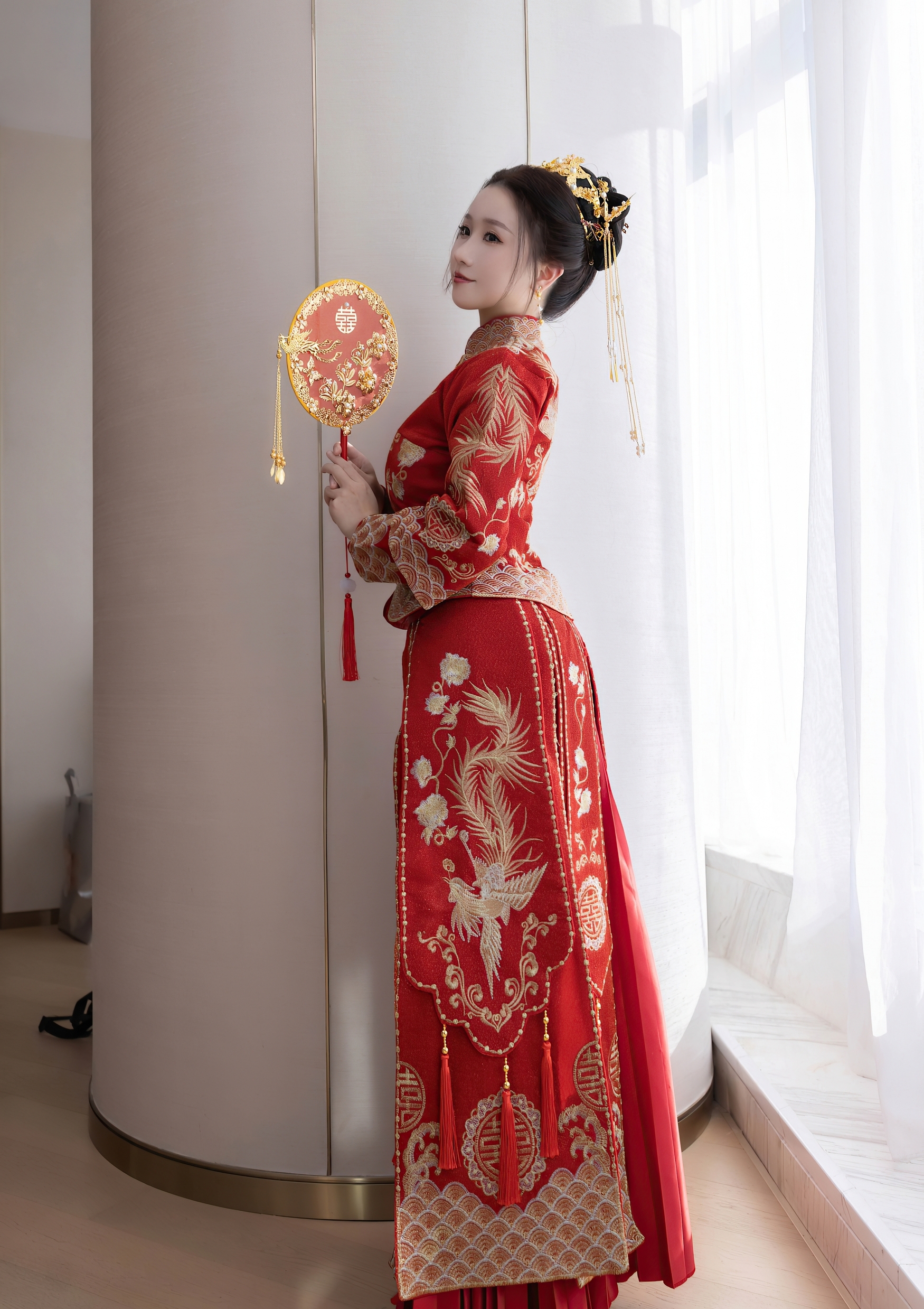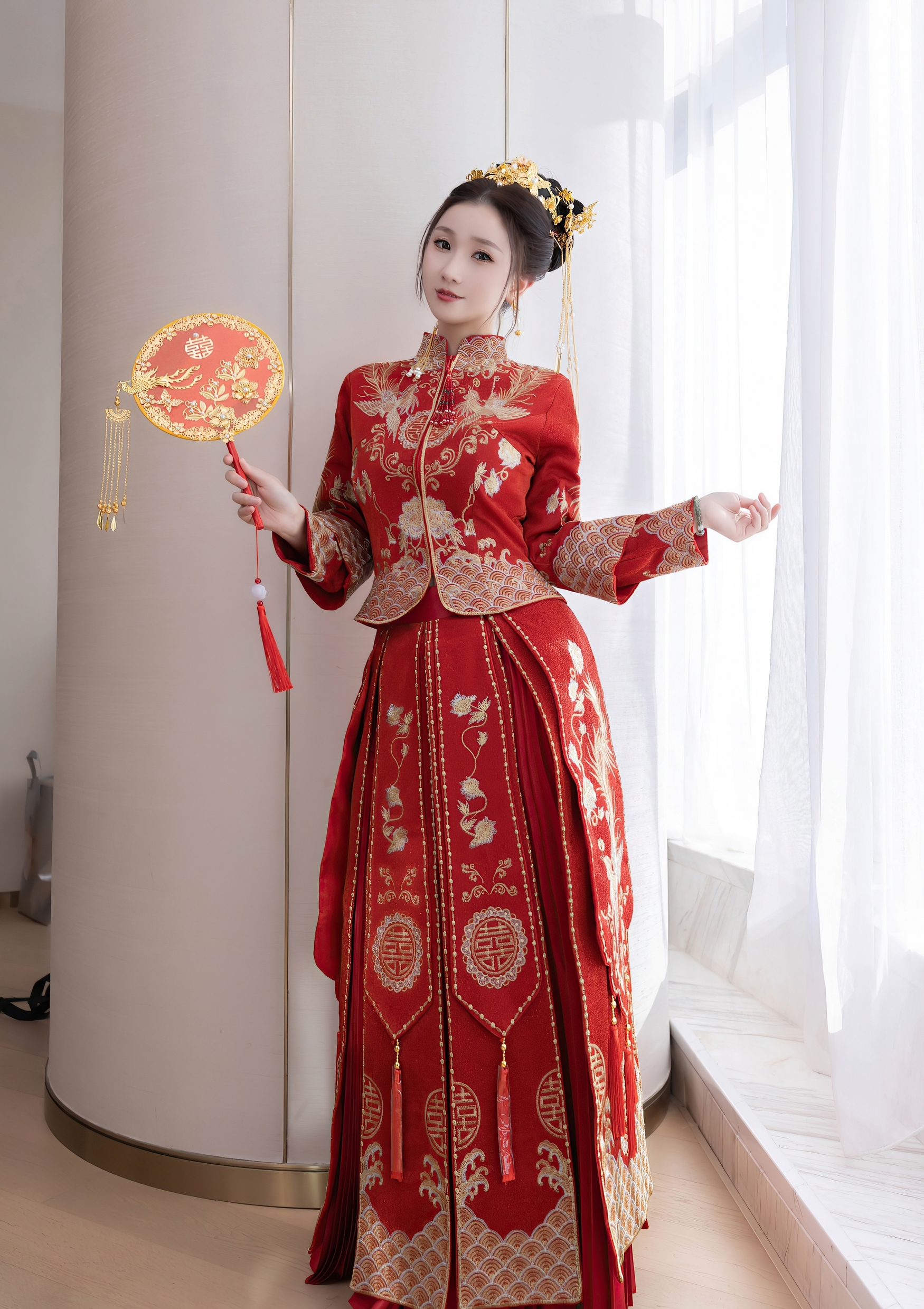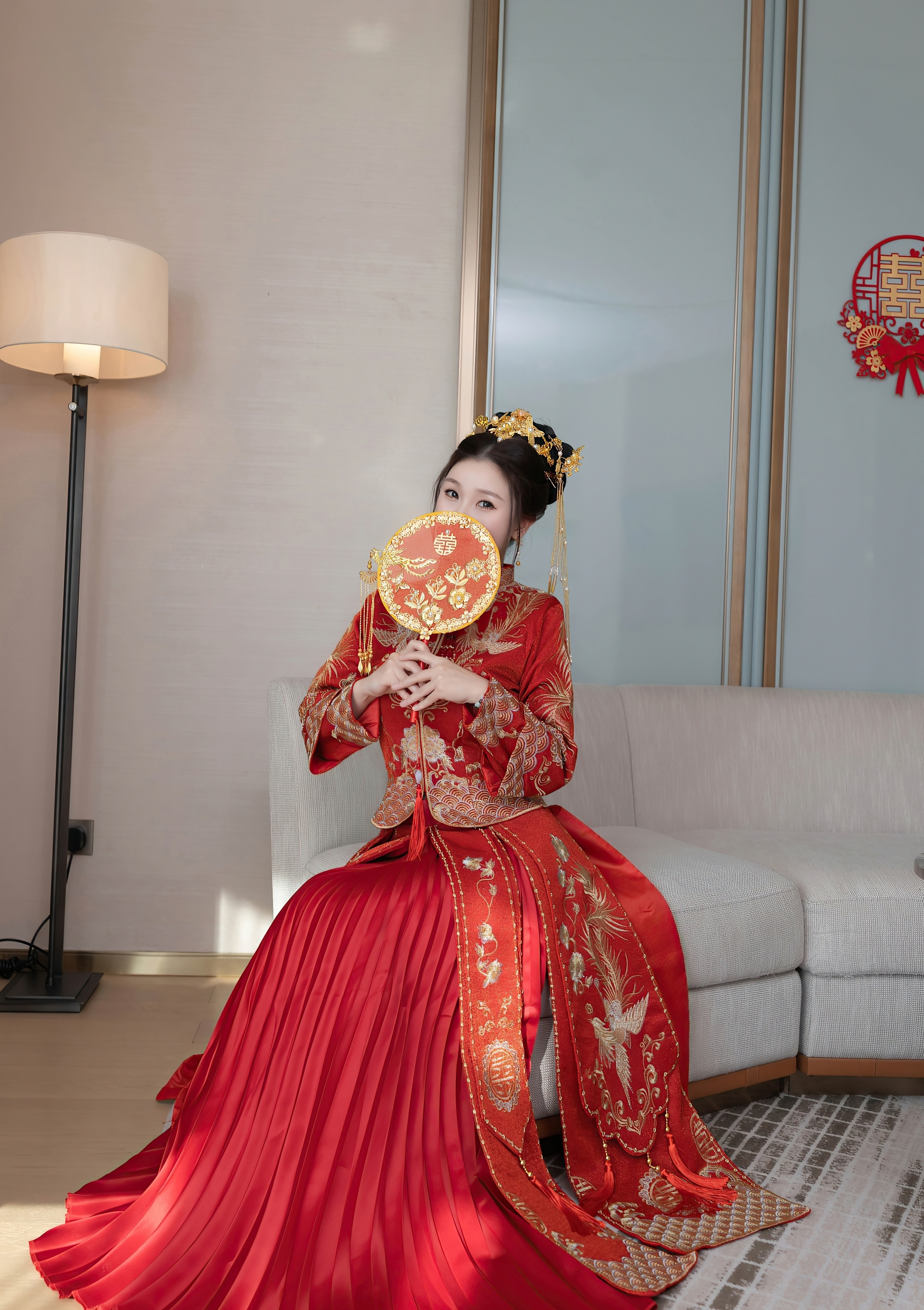 她身着一袭正红秀禾服,金线织就的凤凰在衣上翩跹起舞,祥云环绕,双喜缠枝,每一针每一线皆诉说着古老而深情的祝福。上衣立领盘扣,剪裁合体,勾勒出温婉的肩颈线条;下摆百褶如波,层层叠叠,似红霞铺展于大地,又似春水泛起涟漪。