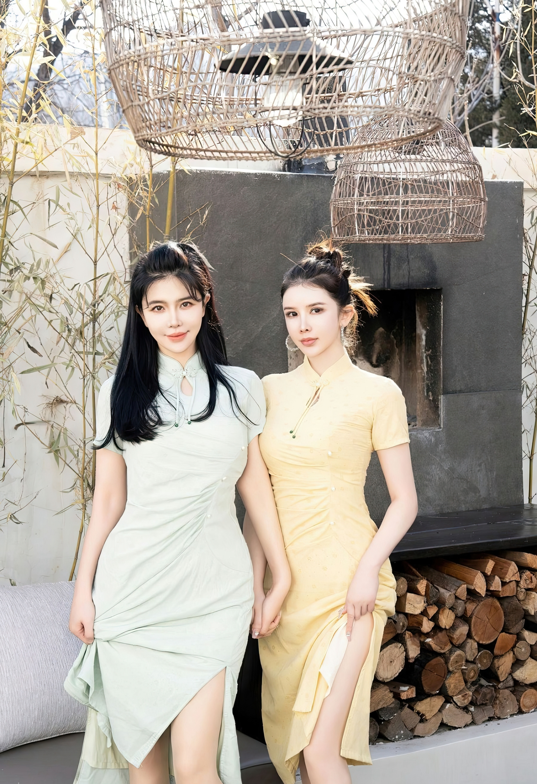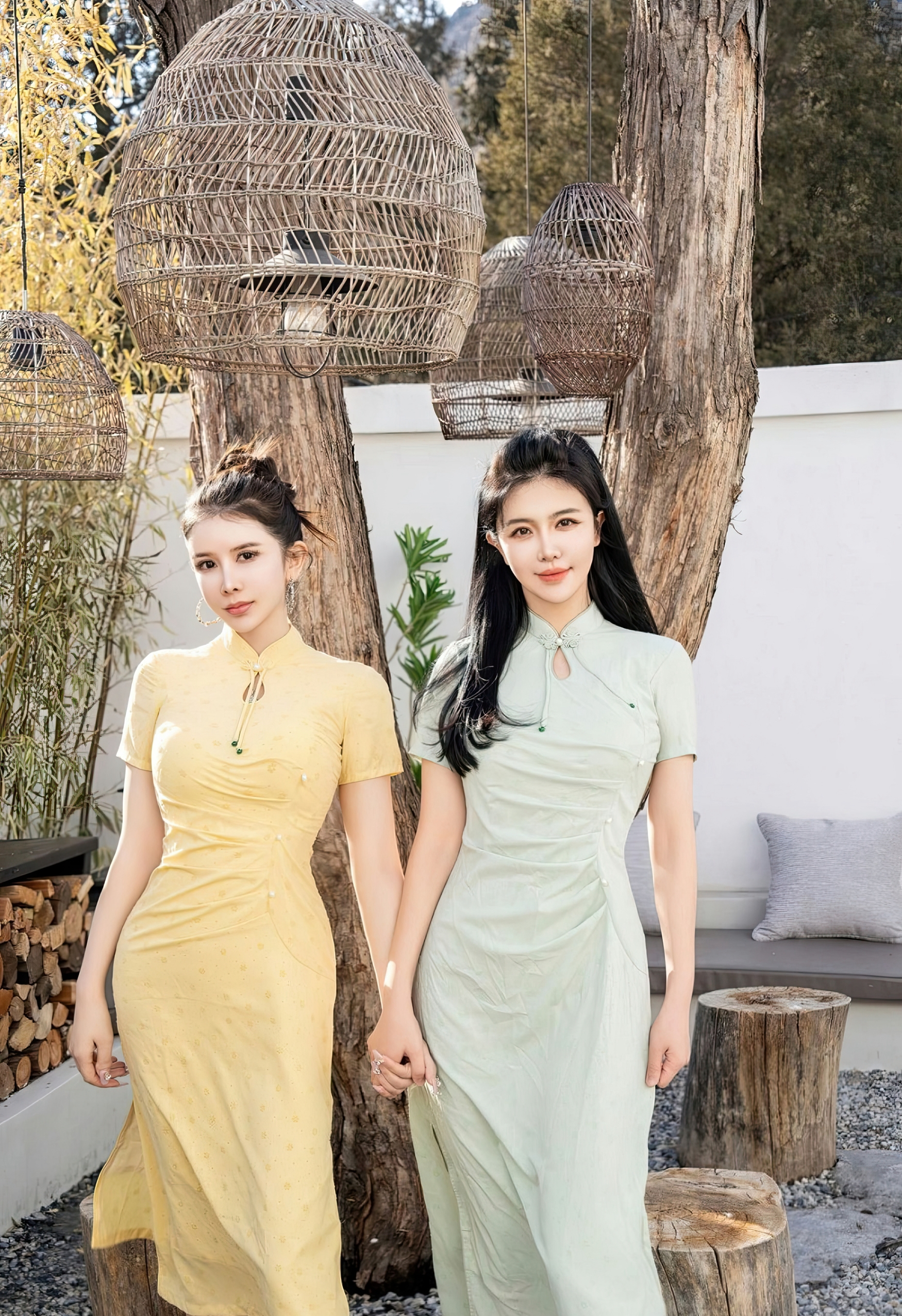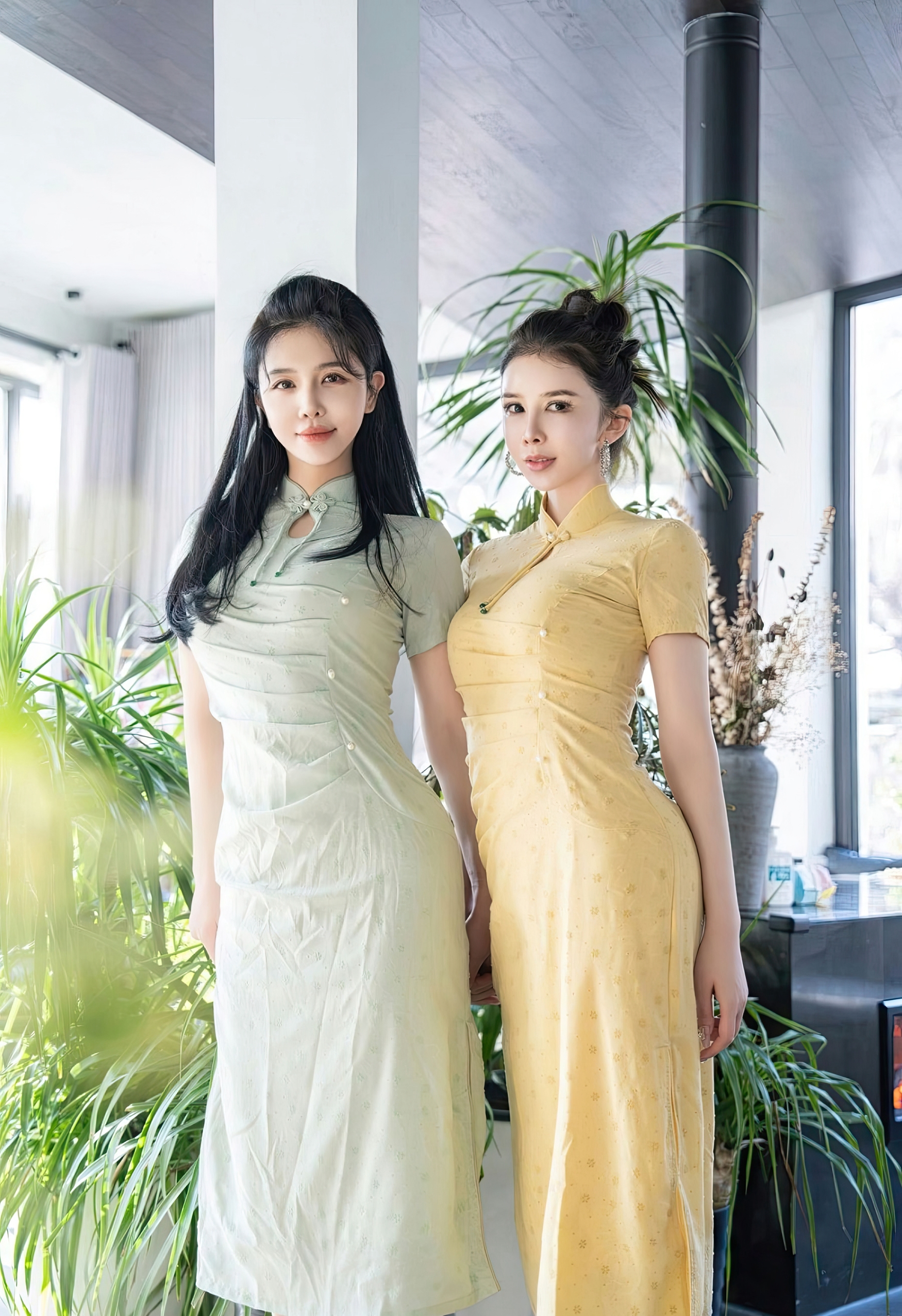 她们穿着改良旗袍,立领盘扣,斜襟微启,珍珠纽扣在光下泛着温润光泽。青绿色如春水初生,淡雅宁静;鹅黄色似暖阳照雪,明媚温柔。裙摆高开叉处,露出修长玉腿,步履间尽是风韵流转。