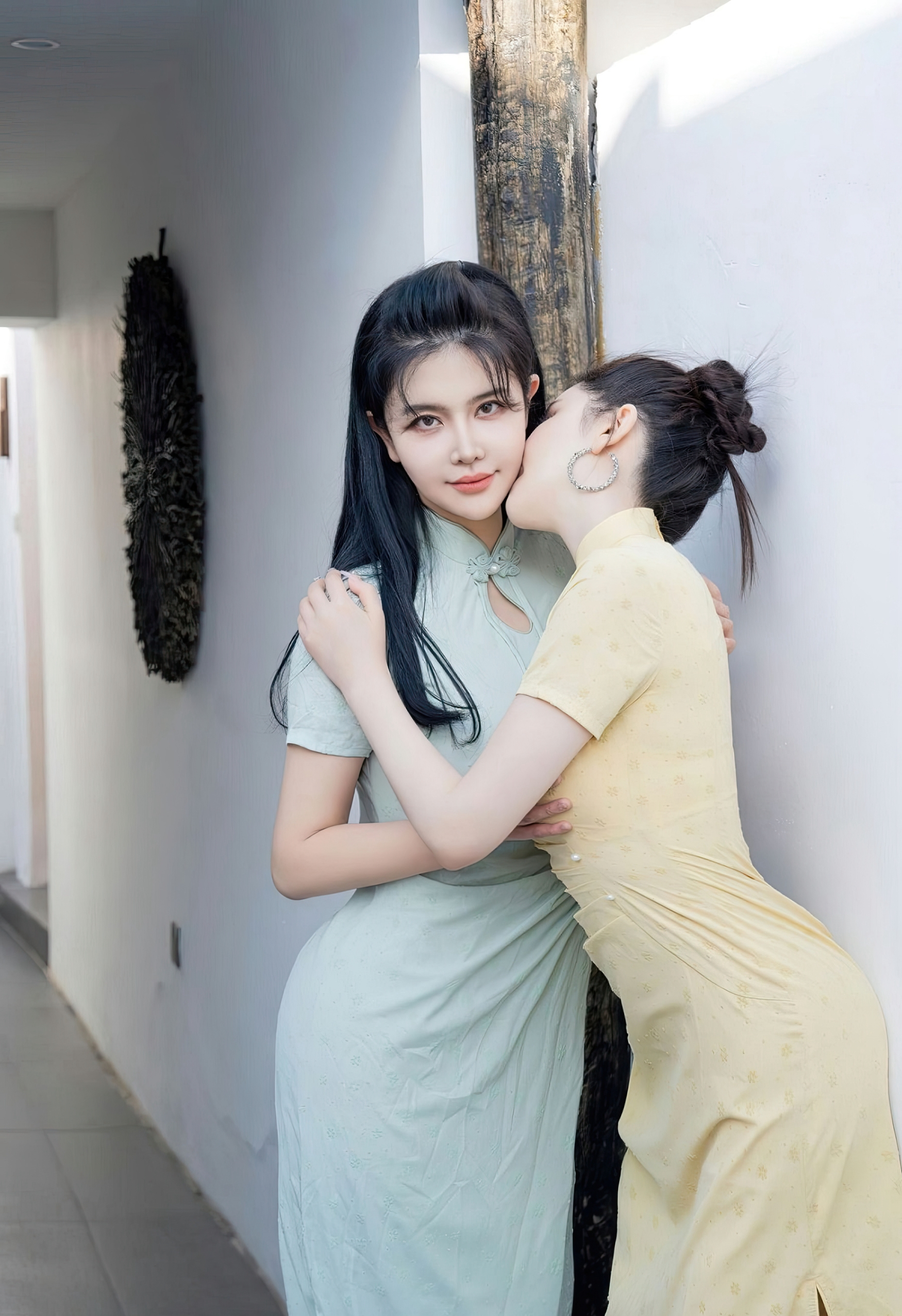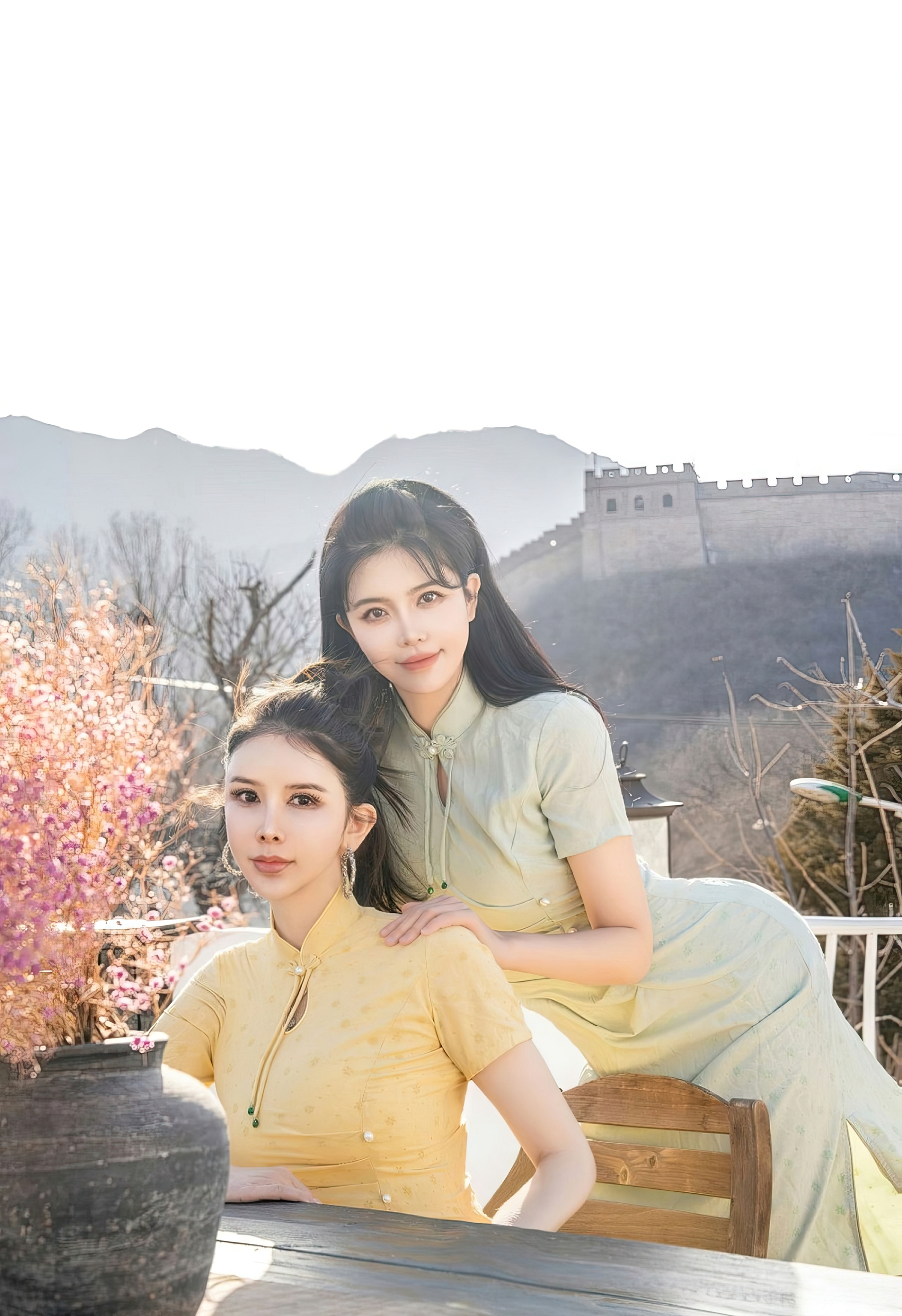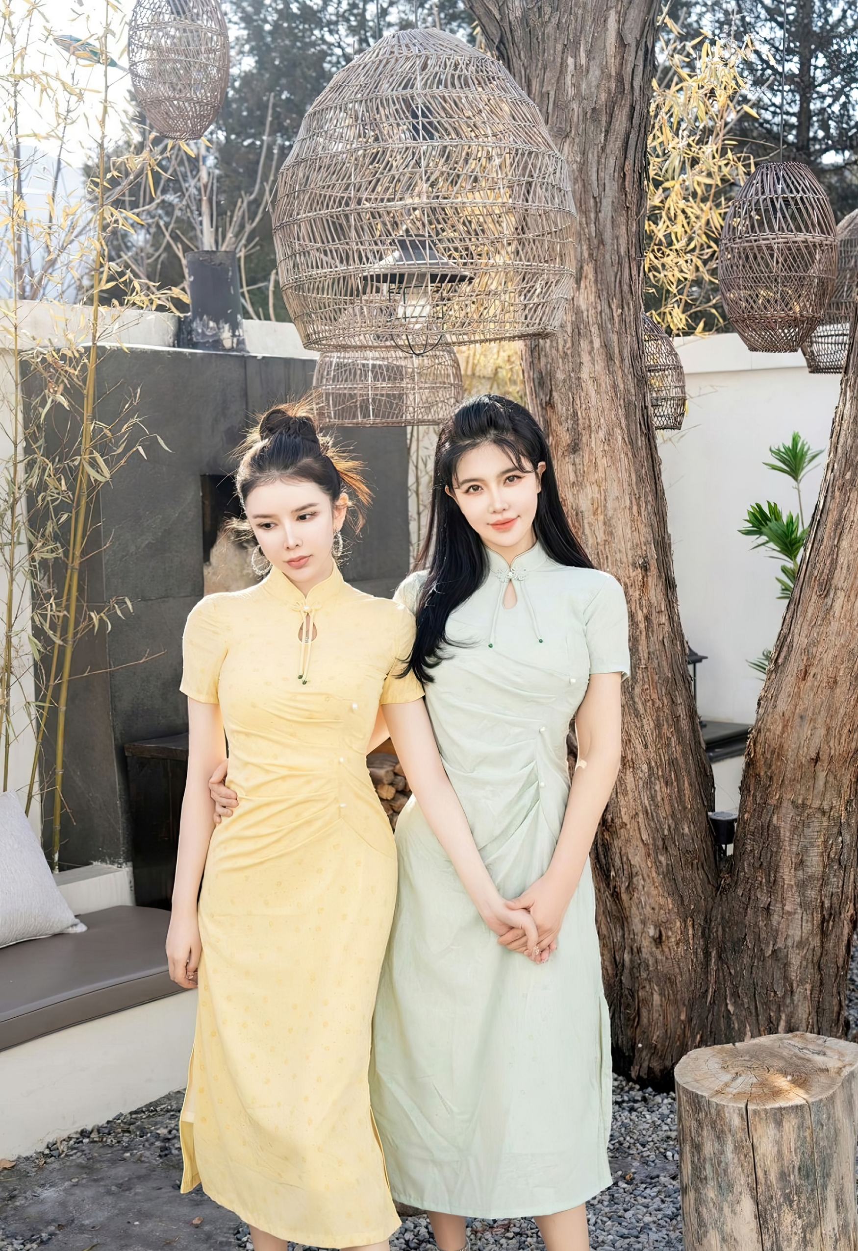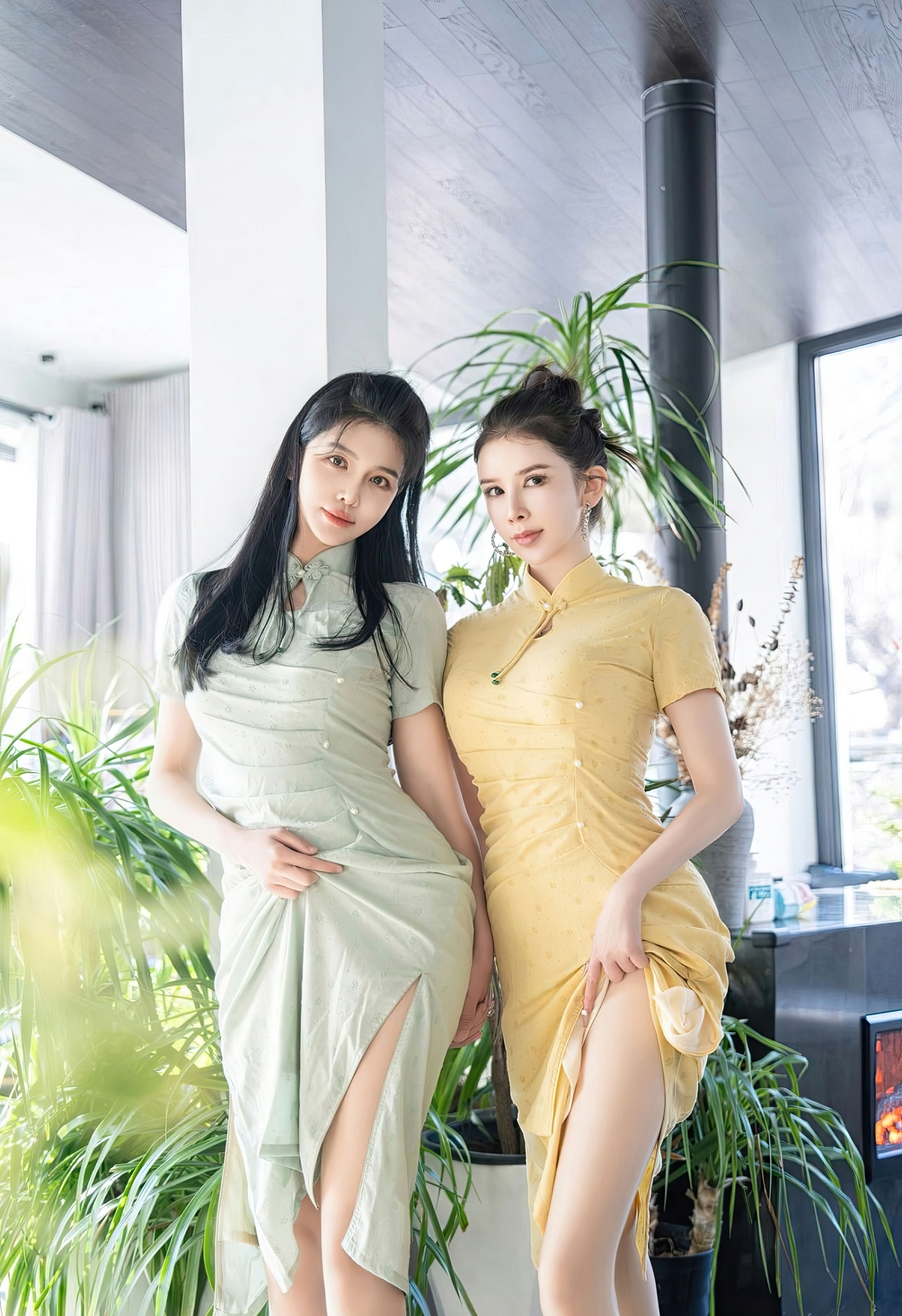 她们穿着改良旗袍,立领盘扣,斜襟微启,珍珠纽扣在光下泛着温润光泽。青绿色如春水初生,淡雅宁静;鹅黄色似暖阳照雪,明媚温柔。裙摆高开叉处,露出修长玉腿,步履间尽是风韵流转。