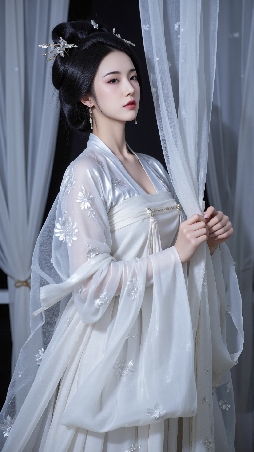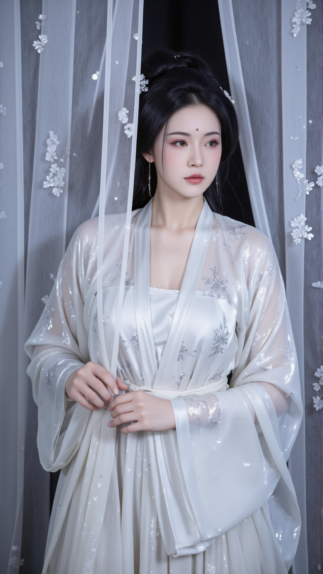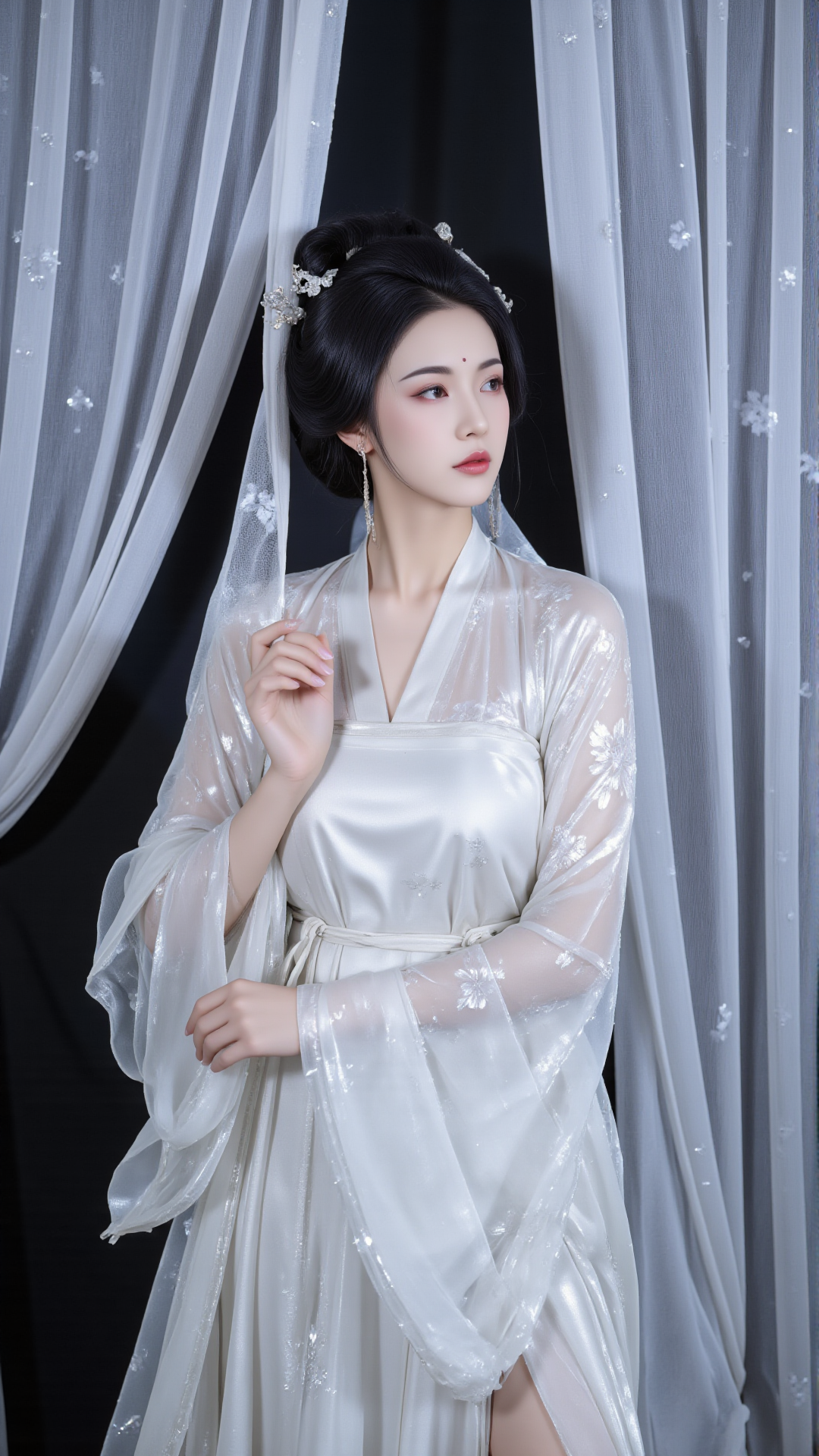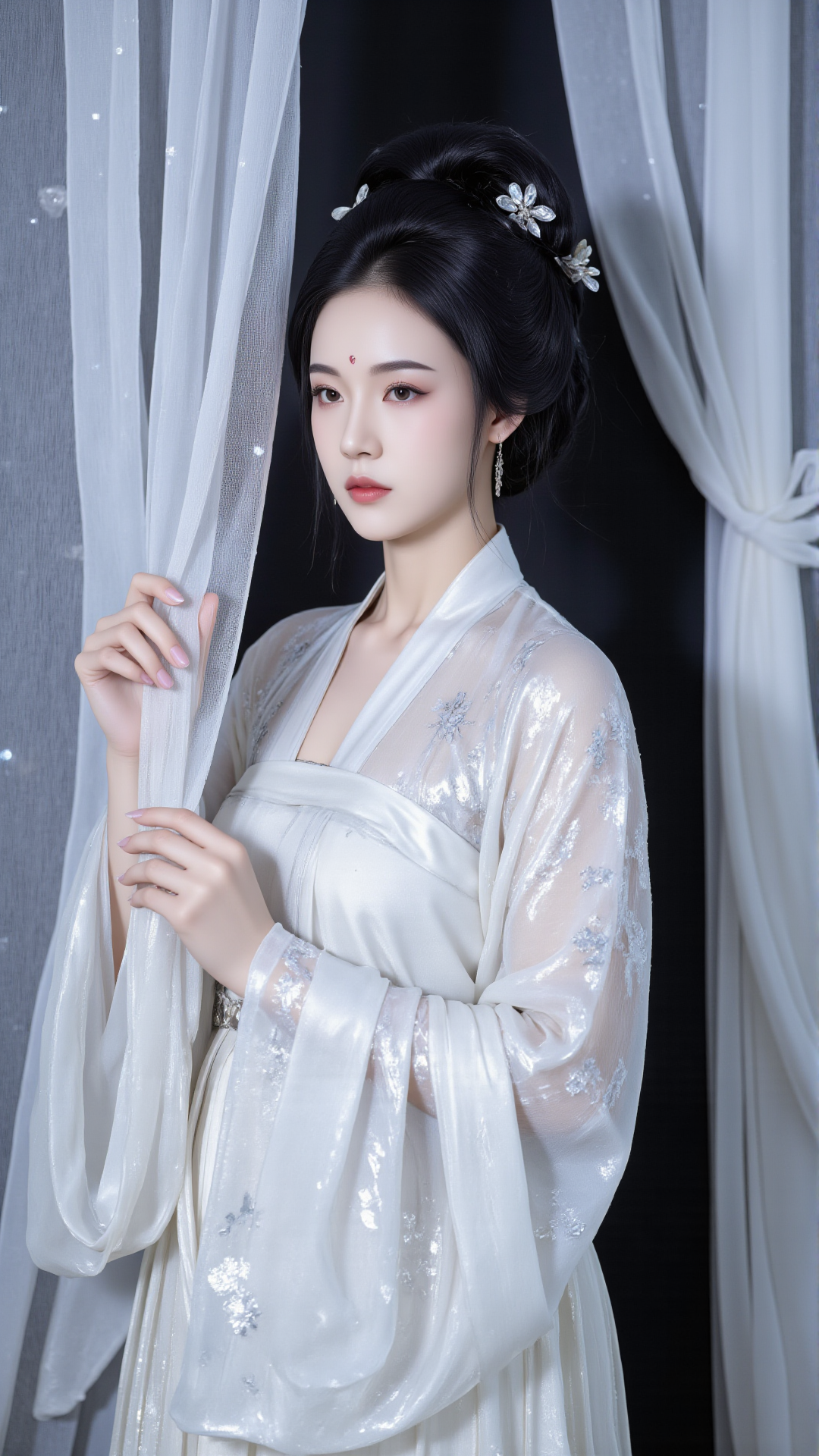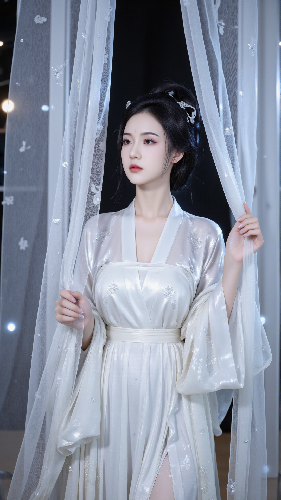 夜色如墨,星河低垂,一帘素纱轻拂,恍若云雾缭绕。她立于帘后,身披一袭白裳,衣袂生辉,宛如月下仙子悄然降临人间。那衣料轻盈如雪,缀着细碎银花,在微光中流转出点点星芒,仿佛将整个银河都织进了这一缕丝线之中。