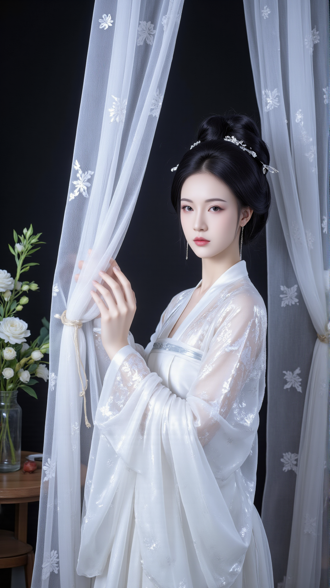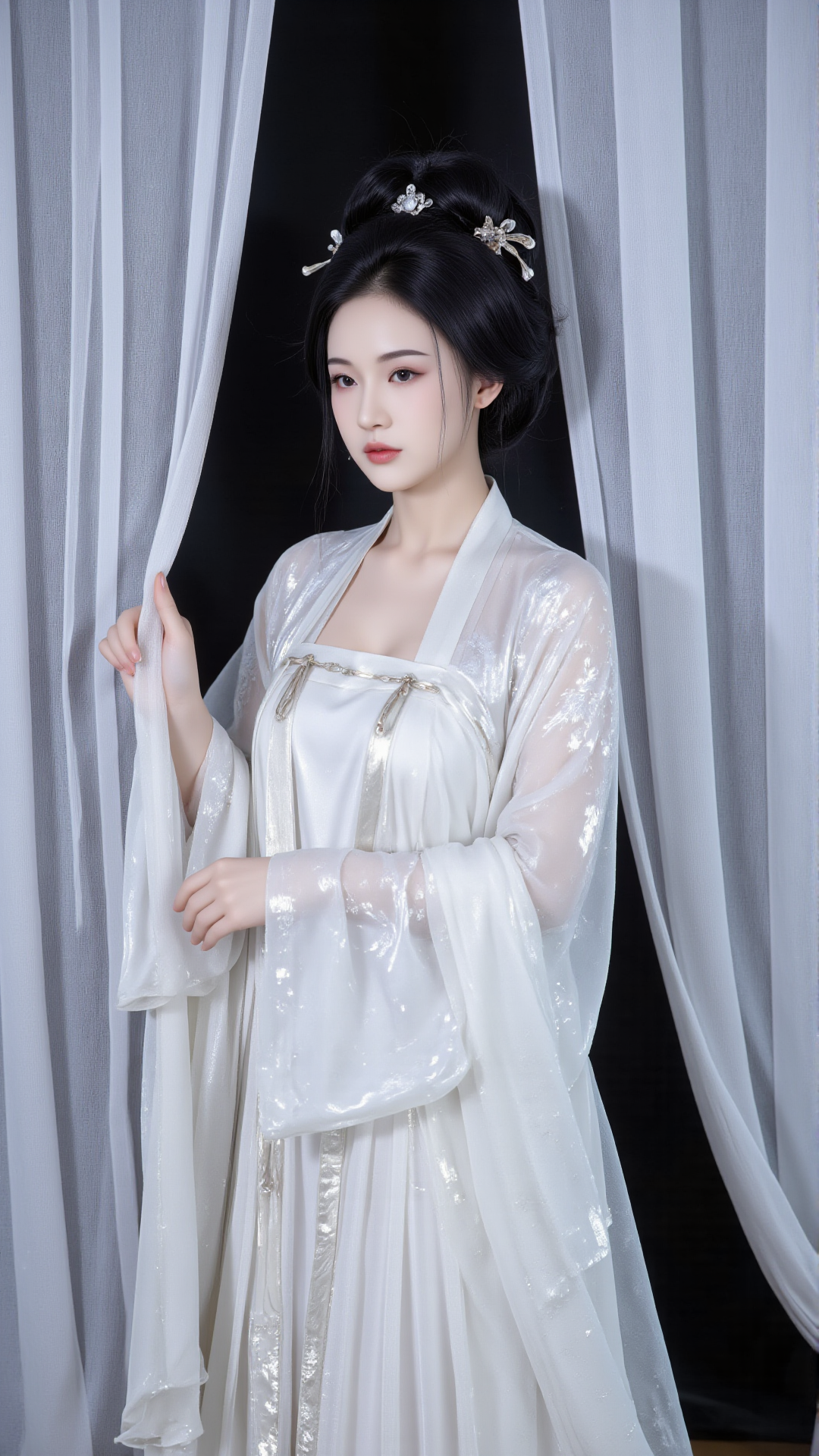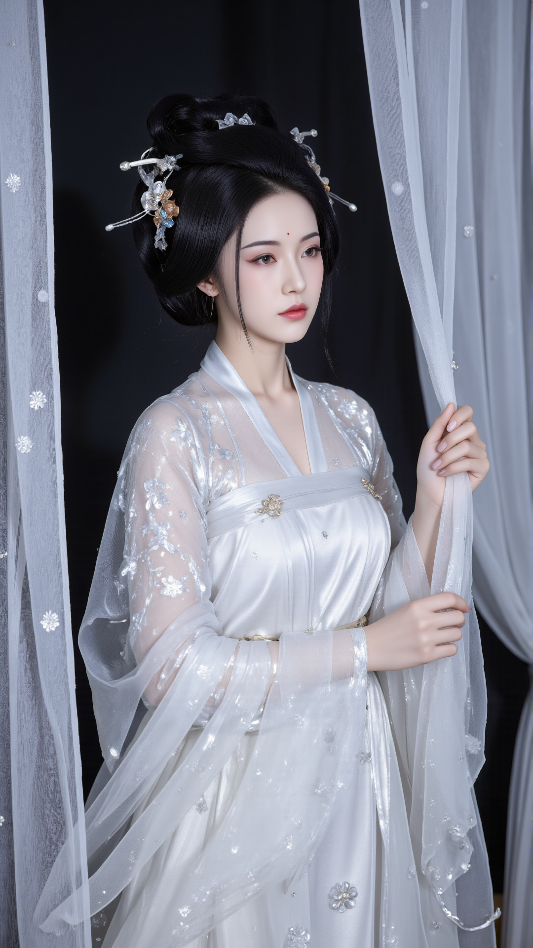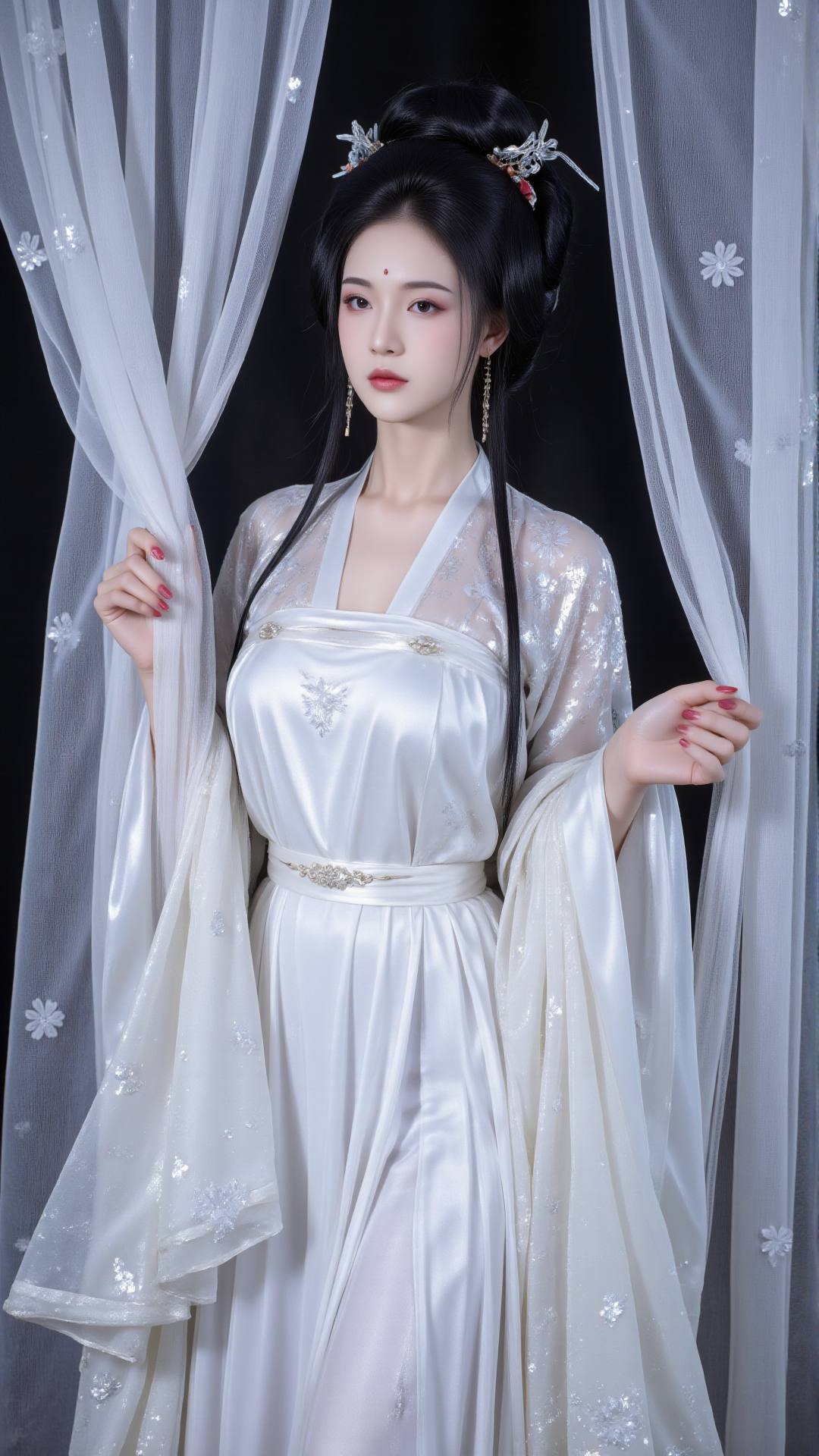 夜色如墨,星河低垂,一帘素纱轻拂,恍若云雾缭绕。她立于帘后,身披一袭白裳,衣袂生辉,宛如月下仙子悄然降临人间。那衣料轻盈如雪,缀着细碎银花,在微光中流转出点点星芒,仿佛将整个银河都织进了这一缕丝线之中。