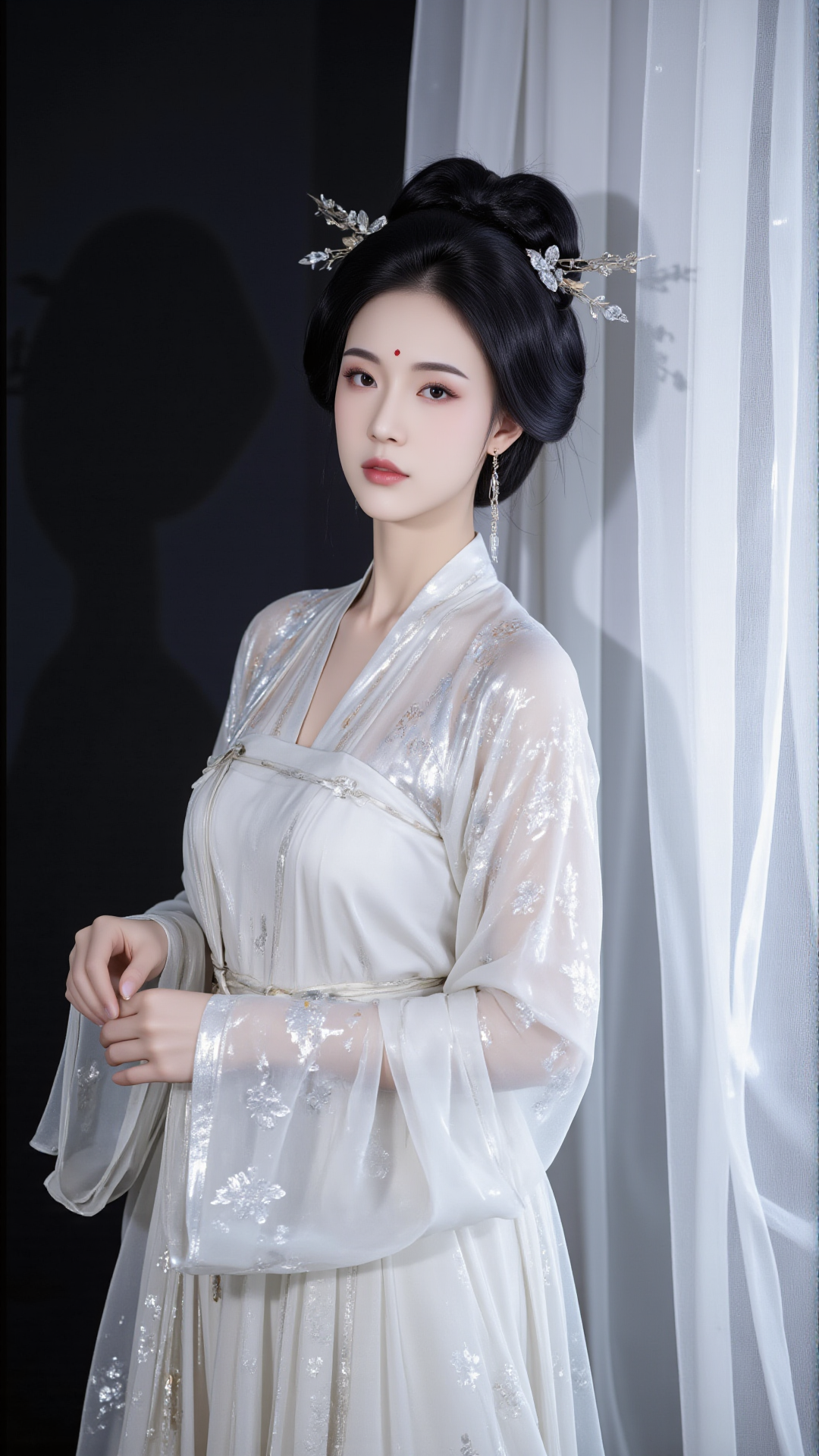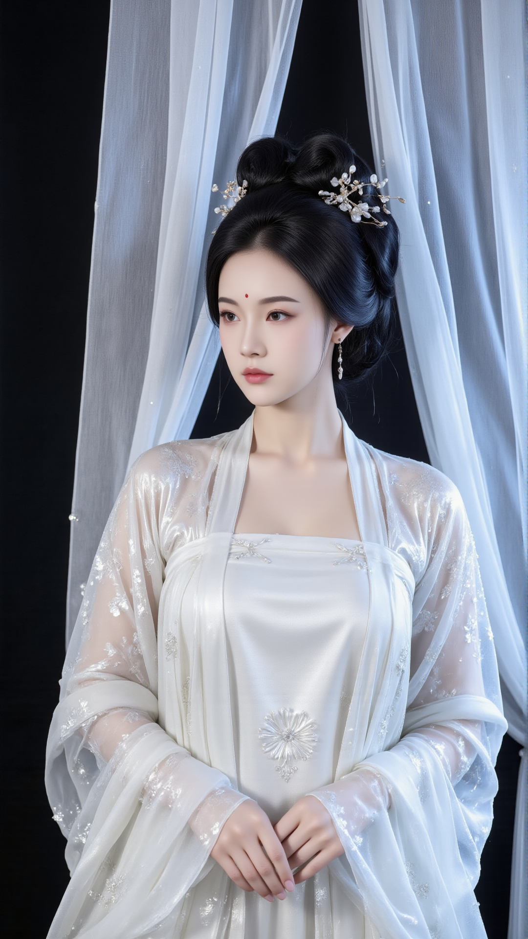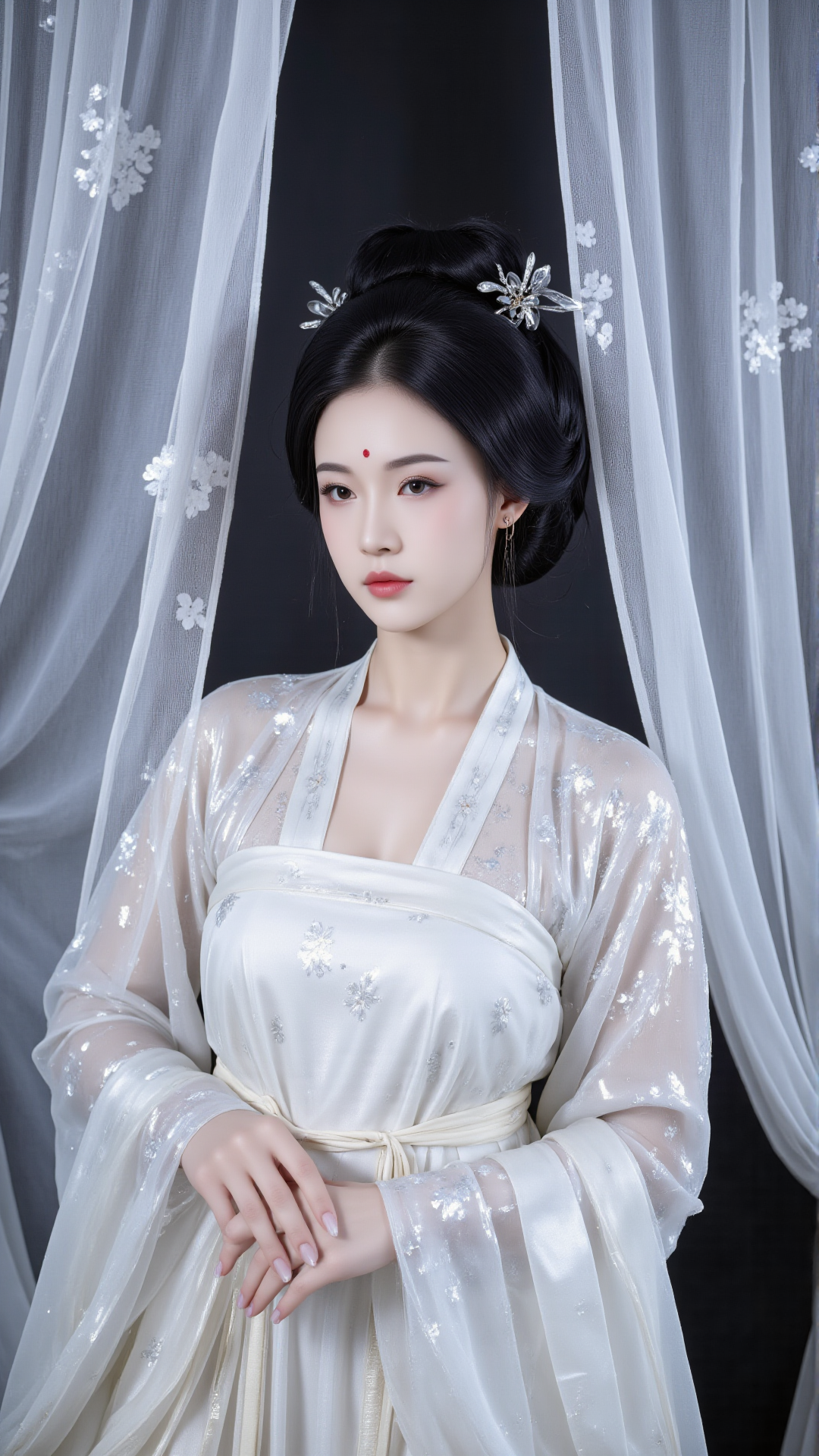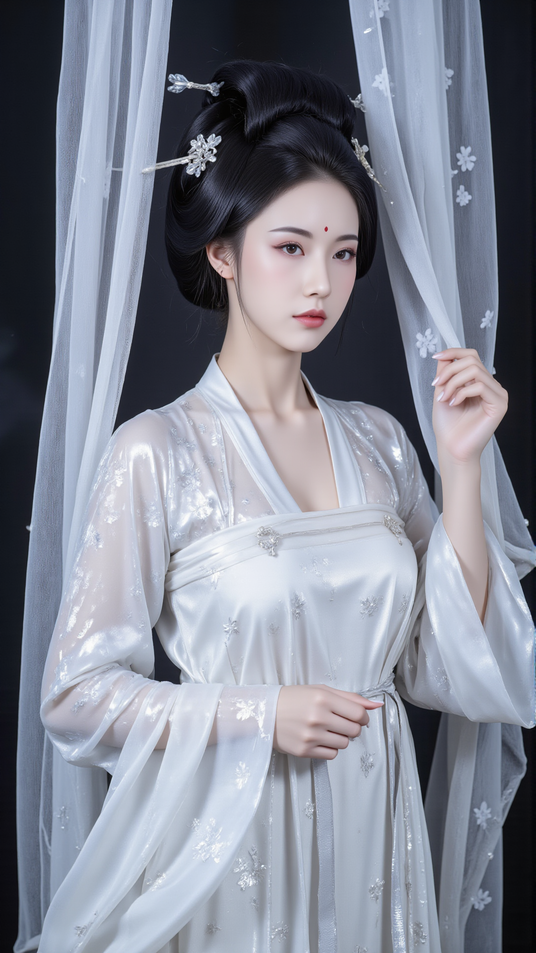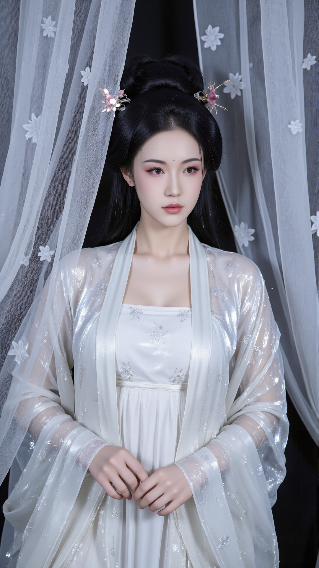 夜色如墨,星河低垂,一帘素纱轻拂,恍若云雾缭绕。她立于帘后,身披一袭白裳,衣袂生辉,宛如月下仙子悄然降临人间。那衣料轻盈如雪,缀着细碎银花,在微光中流转出点点星芒,仿佛将整个银河都织进了这一缕丝线之中。