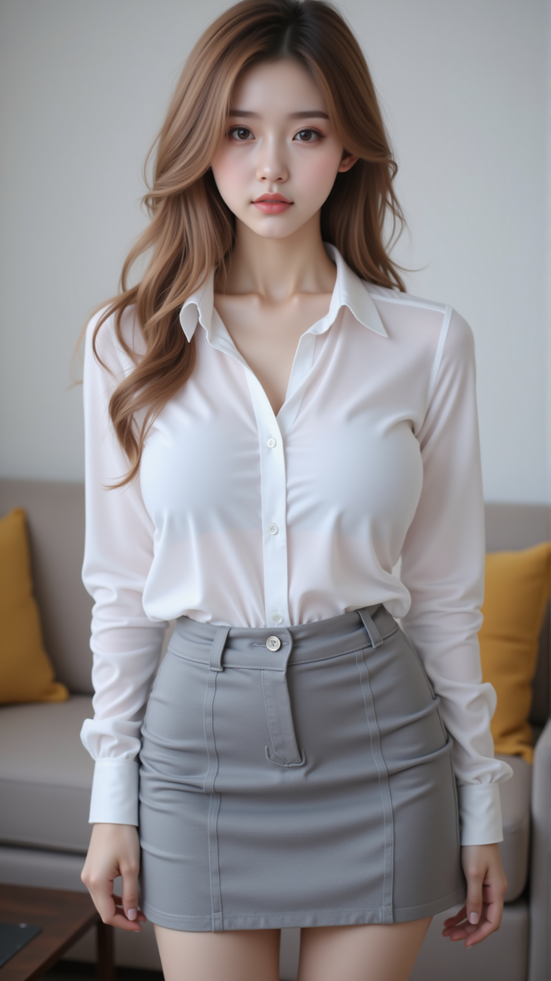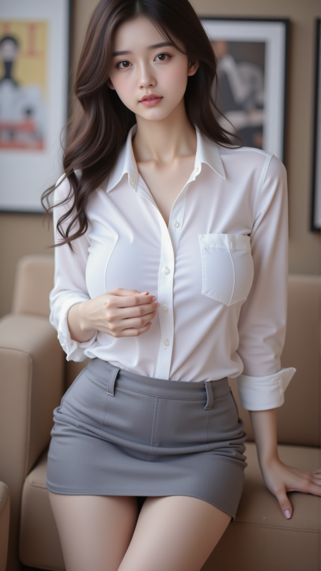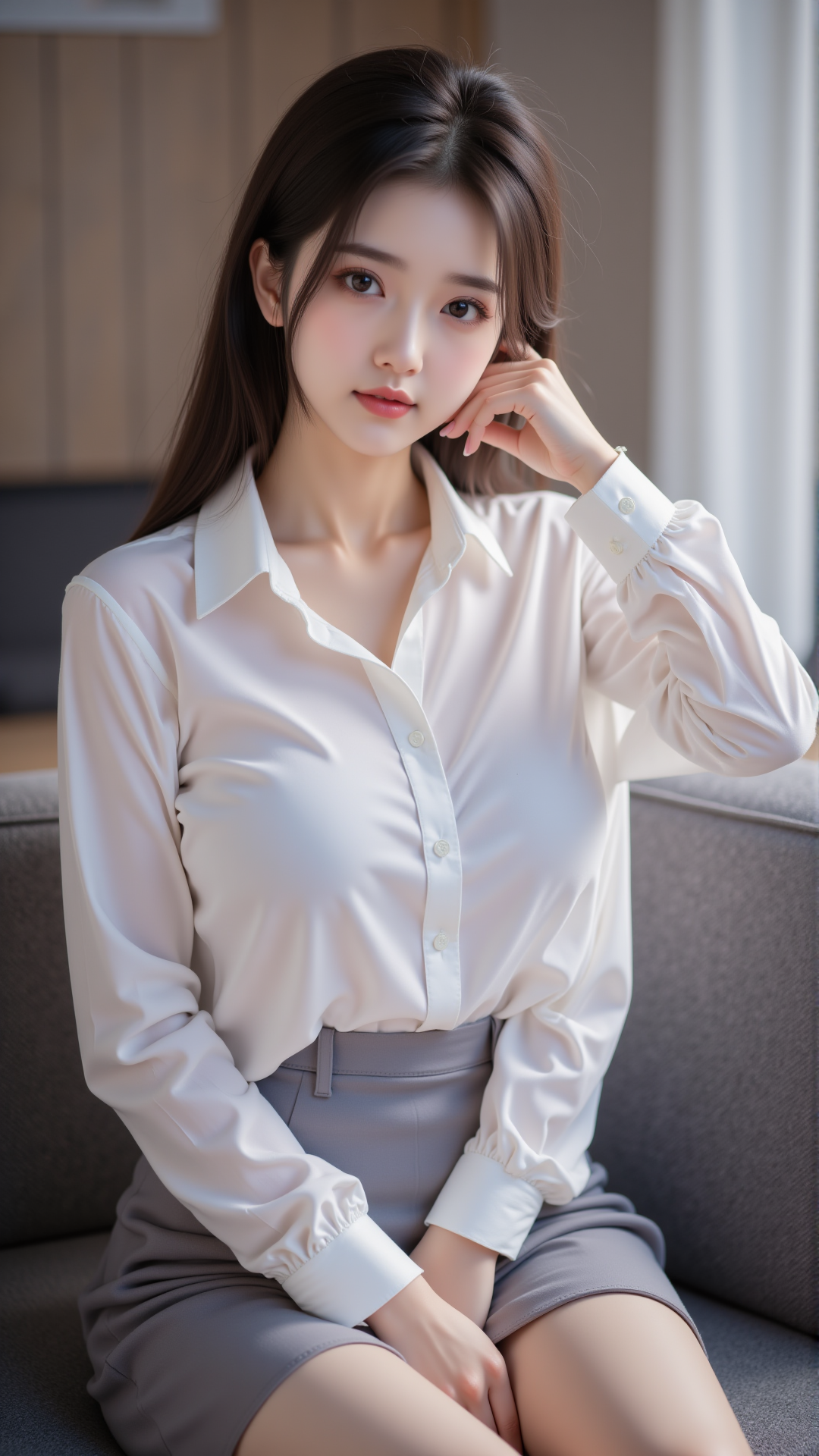 在晨光微熹的办公室里,她轻轻拉开窗帘,一缕阳光洒落在她的肩头。白色衬衫如云般纯净,勾勒出她温婉的轮廓;灰色短裙贴合腰线,仿佛是大地与天空之间的温柔交界。她坐在木质桌前,指尖轻触笔尖,目光沉静而深远,仿佛在思索着某个未完成的梦。