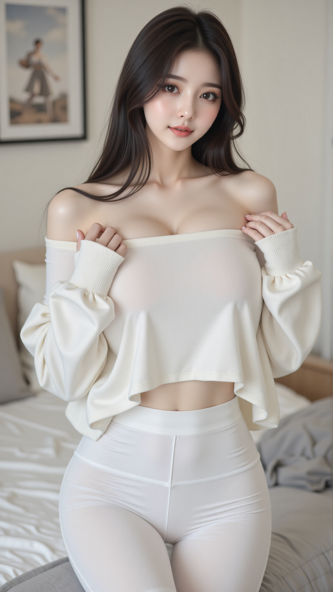 晨光悄然漫过窗棂,如一层薄雾轻轻拂过她的发梢。她坐在床沿,身着一袭纯白,仿佛从梦境中走出的仙子。柔软的针织衫微微滑落肩头,露出细腻的锁骨与温润的肌肤,像初雪覆盖在山峦之上,纯净而不可侵犯。她的手指轻抚衣襟,动作轻柔得如同怕惊扰了这清晨的宁静。