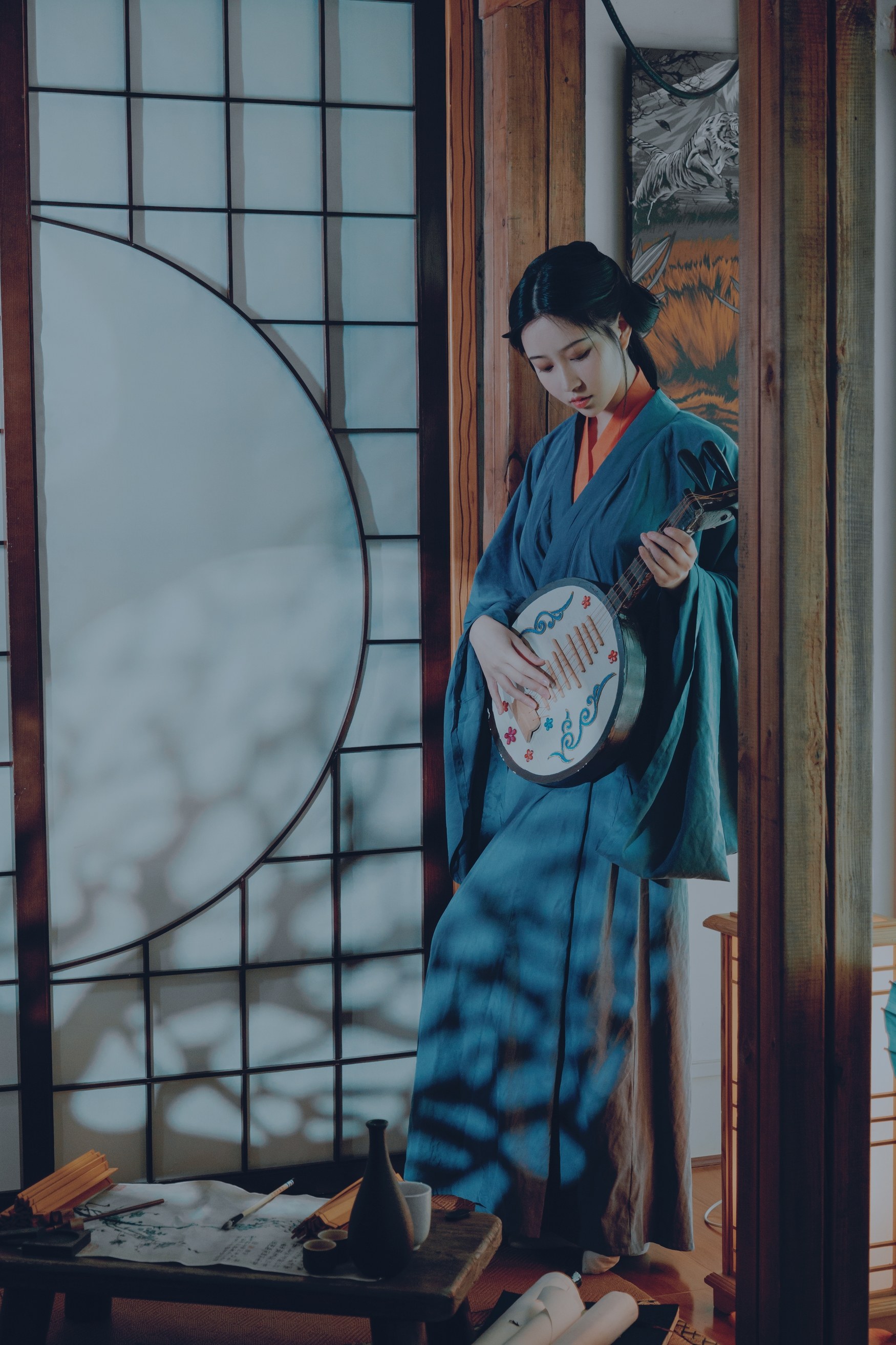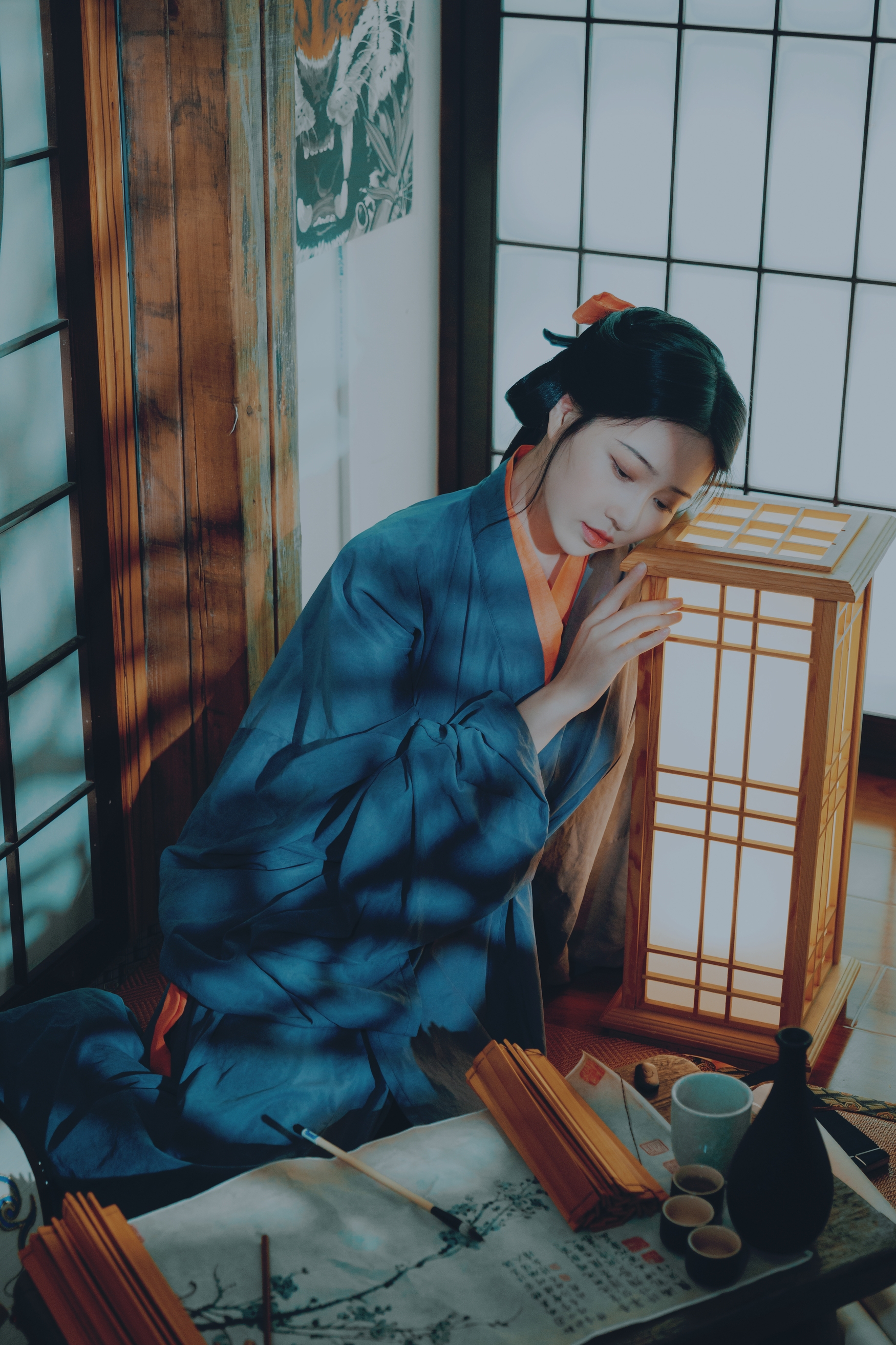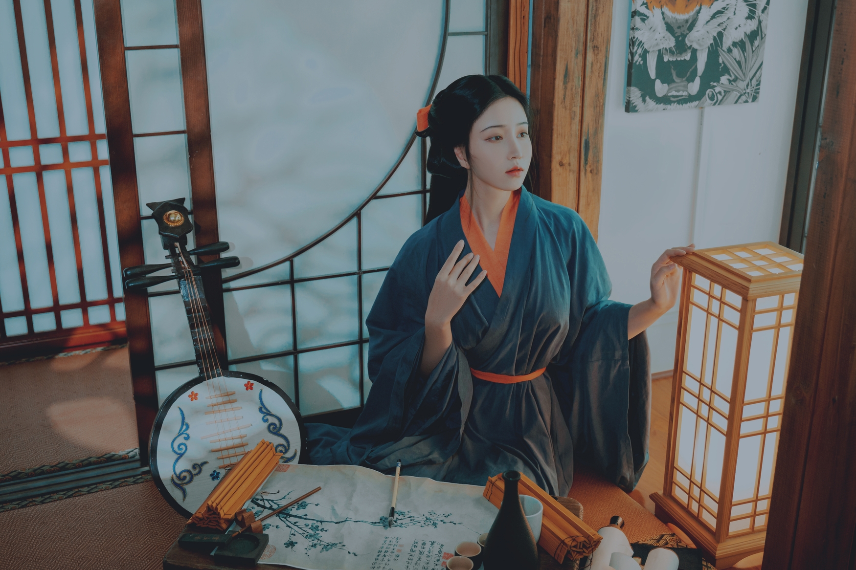 晨光初透,斜斜穿过格子窗棂,在青砖地上投下斑驳的影。她静坐于榻上,身着一袭深蓝曲裾汉服,衣领处一抹橙红如朝霞初染,温润而克制。长发低挽,一支素黑发簪轻轻别住,余丝垂落肩头,随呼吸微微颤动。